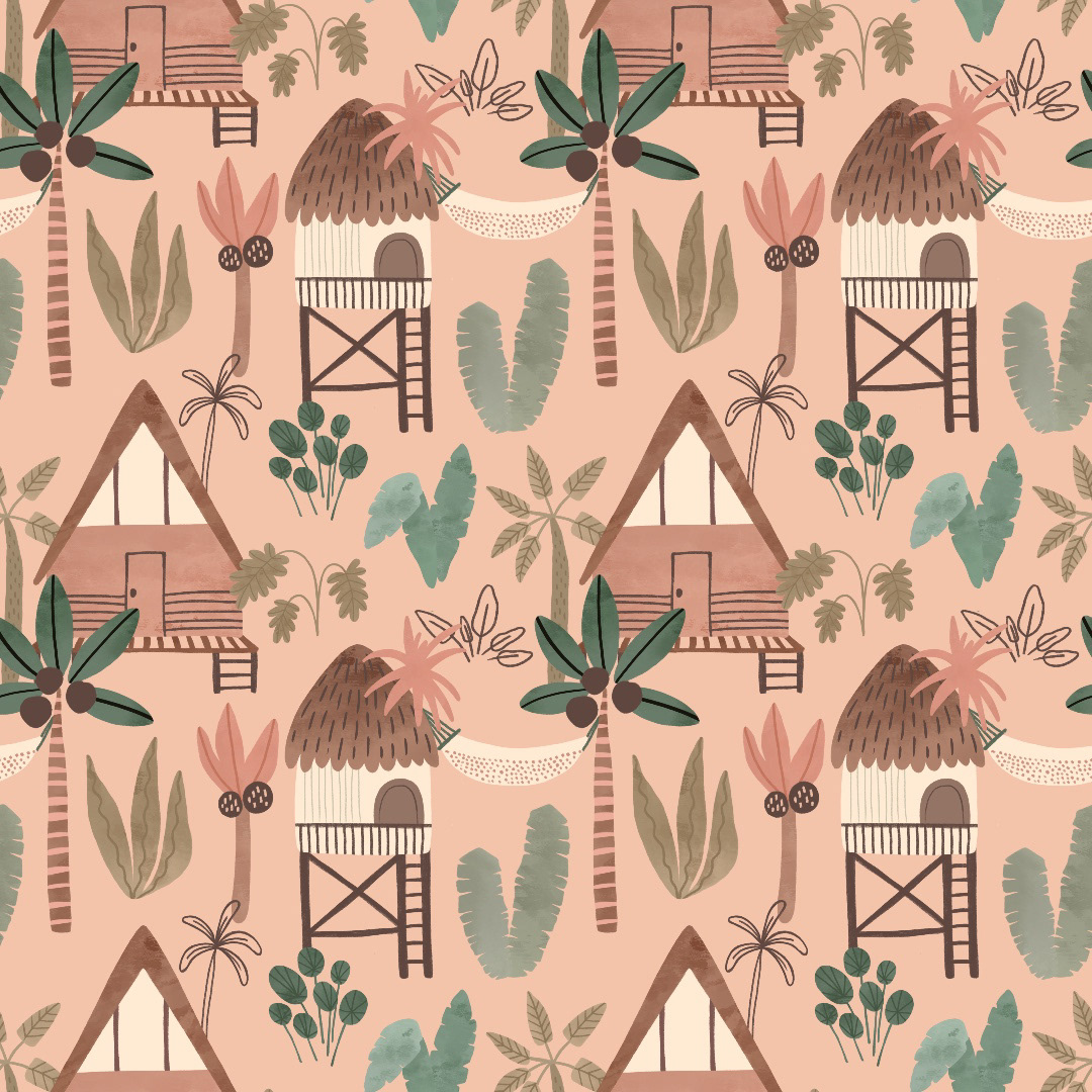 Pink tropical puttern design. Big banana leaves, palm trees, cute cabins. Summer vibes print, rainforest floral surface design.