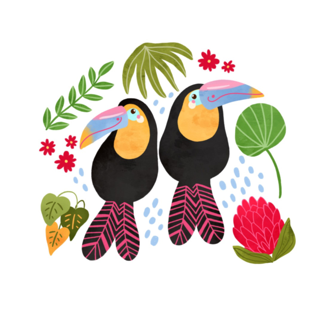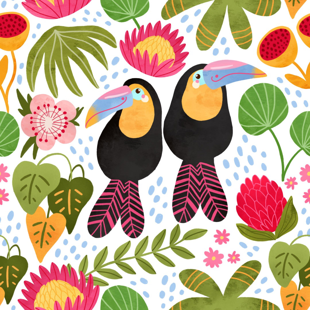 Watercolor toucan birds seamless pattern in a tropical jungle, Australian protea flowers, palm tree, exotic leaves, bight summer repeat background, childish textile design, Hawaii vibe print, wallpaper