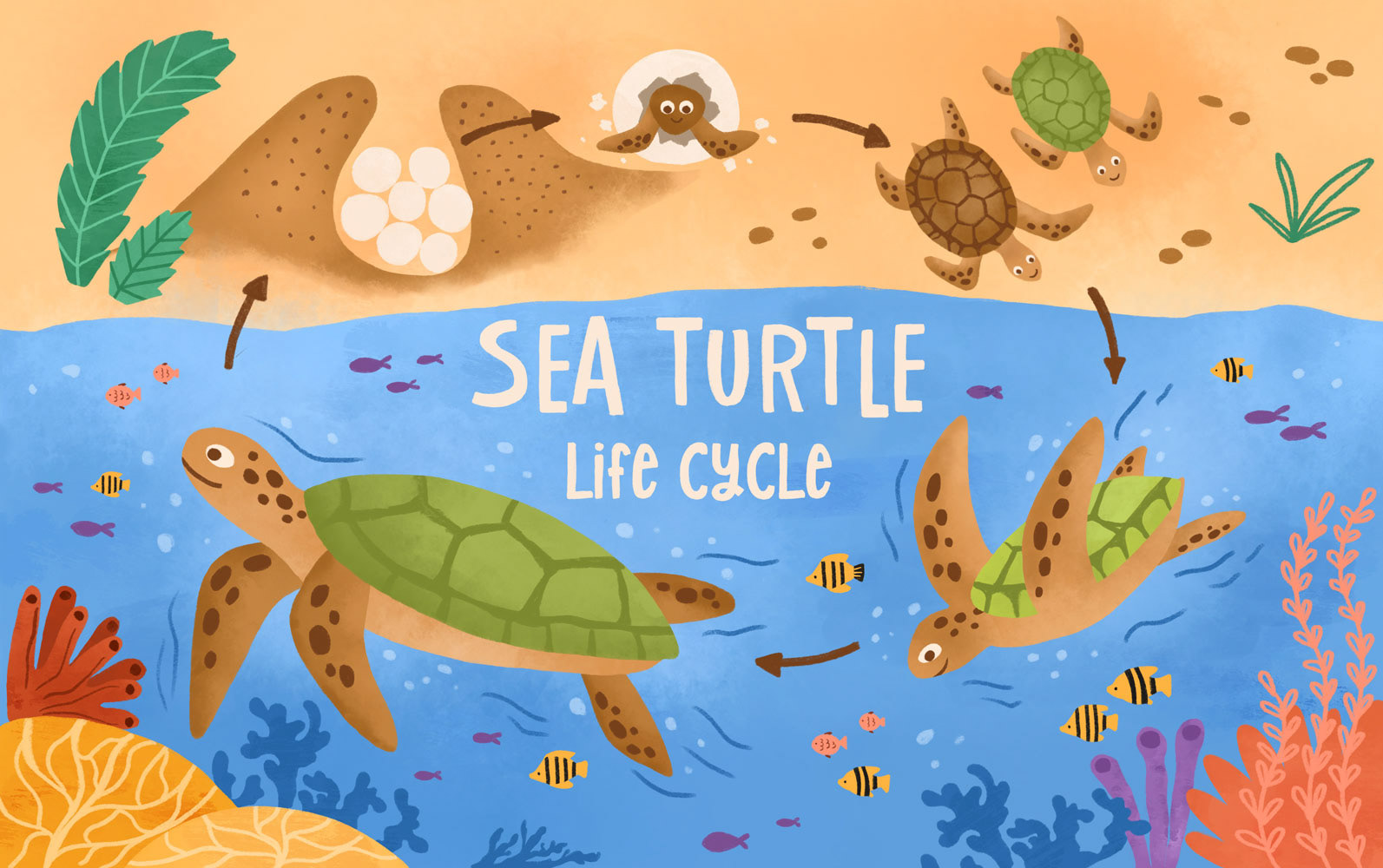 Sea turtle life cycle diagram. Studying marine life is exciting for kids. For preschoolers who interested in sea turtles.